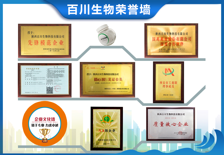 ??? 專利成果 創(chuàng)新是企業(yè)持續(xù)發(fā)展的動(dòng)力保證。陜西百川生物通過原始創(chuàng)新、集成創(chuàng)新和引進(jìn)消化吸收再創(chuàng)新,形成了微生物發(fā)酵、工藝開發(fā)、天然產(chǎn)物提取等多項(xiàng)核心技術(shù),實(shí)現(xiàn)了系列產(chǎn)品生產(chǎn)技術(shù)的全面提升?,F(xiàn)已申請(qǐng)和授權(quán)包括《魚皮膠原蛋白生物活性小肽及其制備方法》、《一種花生多肽及其制備方法》等在內(nèi)的近百項(xiàng)功能驗(yàn)證專利。全面運(yùn)用于產(chǎn)品生產(chǎn),贏得市場(chǎng)好評(píng)。